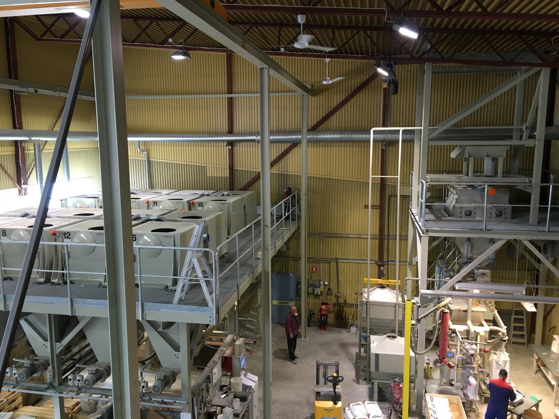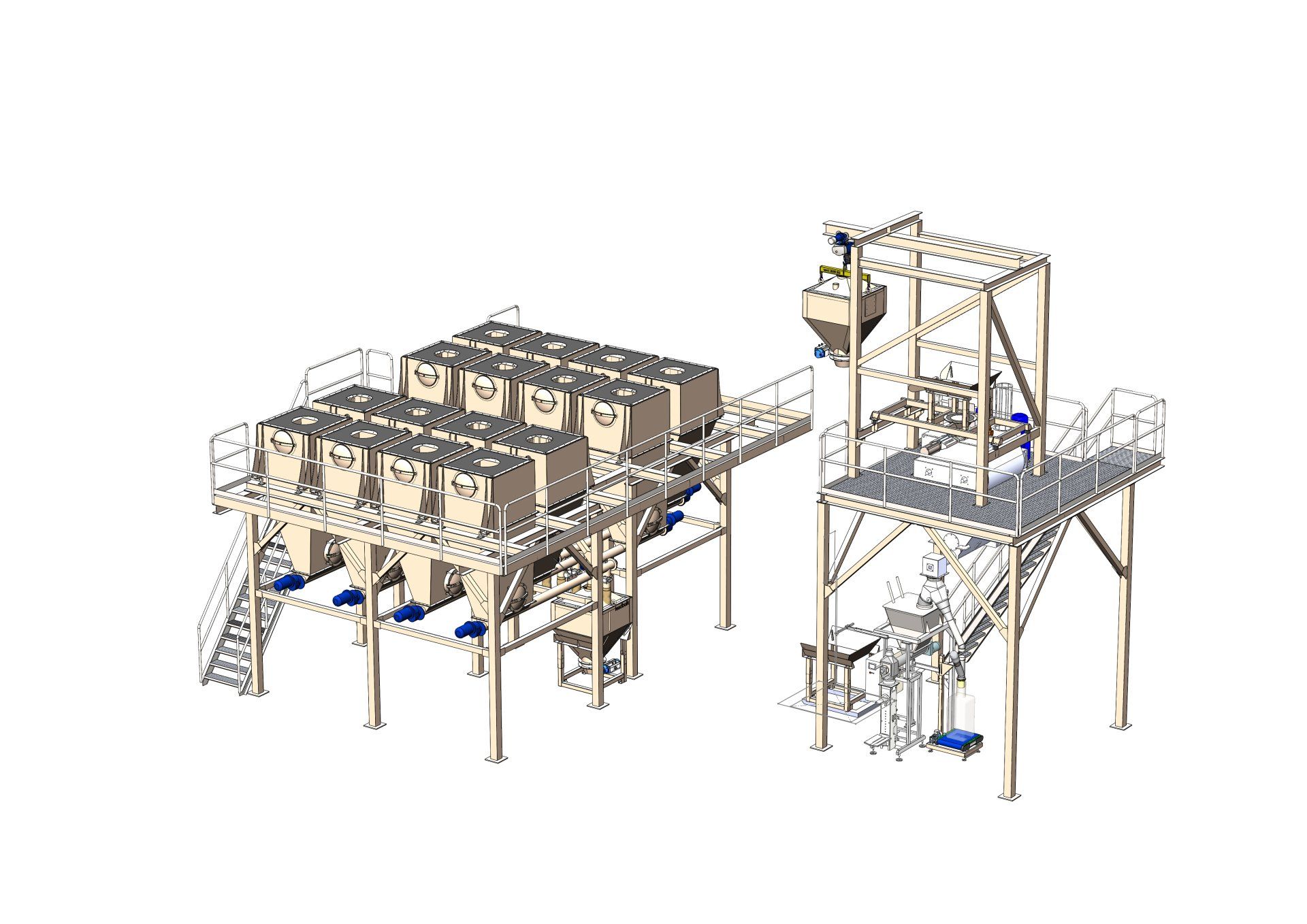 Efter blandning faller produkten via fördelare till antingen storsäcksfyllning eller småsäcksfyllning.
