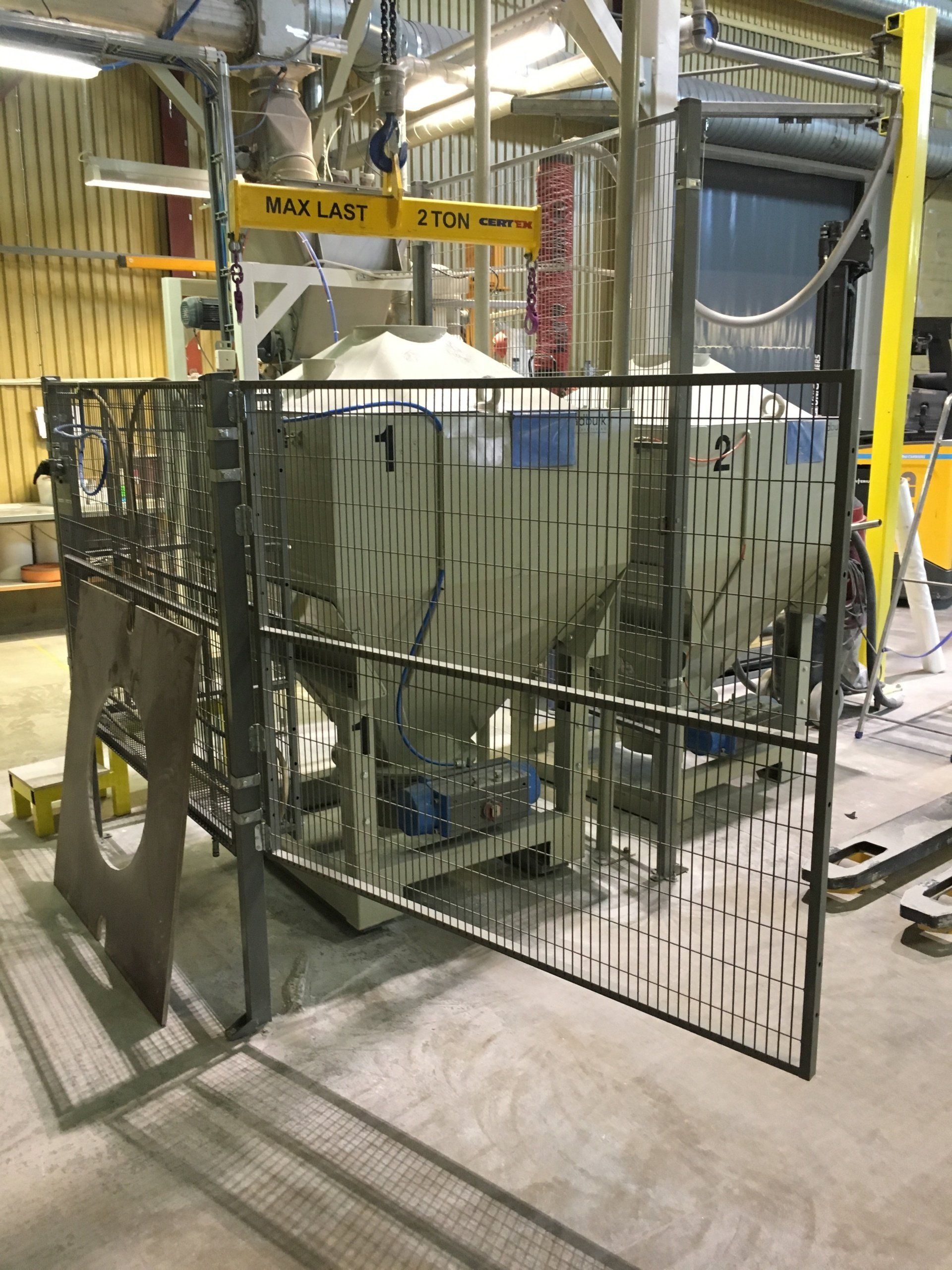 Behållarna är individuellt upphängda på lastceller. Utmatning med 16 st skruvtransportörer som doserar till en mobil behållare med "loss in weight"