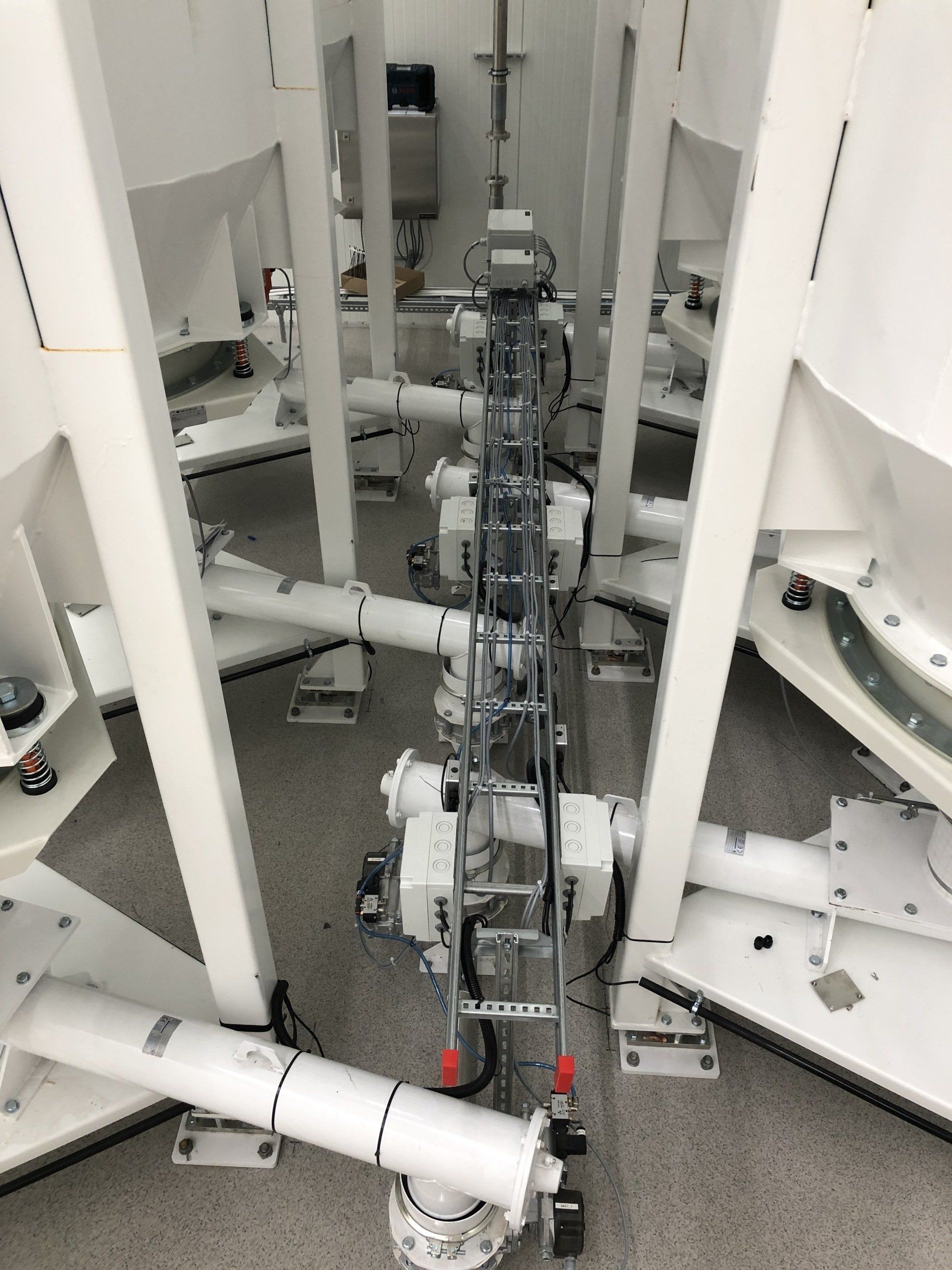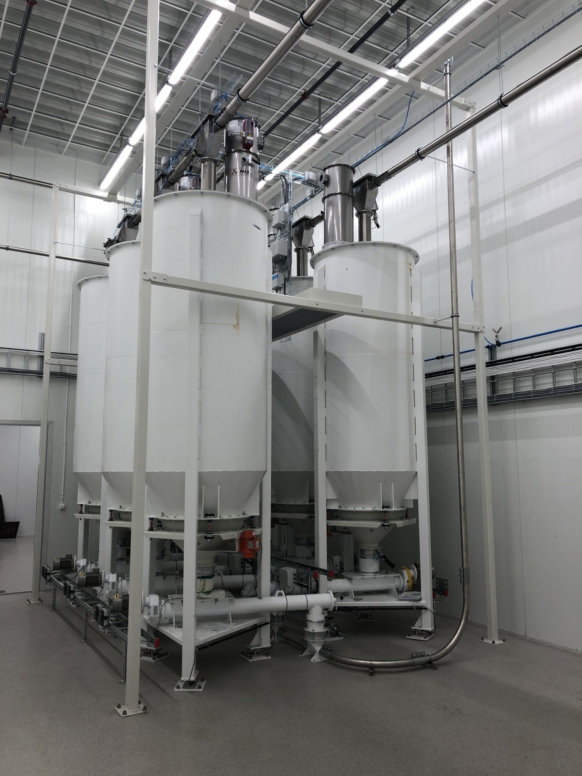 -Lagringsbatteri bestående av silos med nivåmätning, aspiratiosfilter, utmatningsutrustning, doseringsutrustning