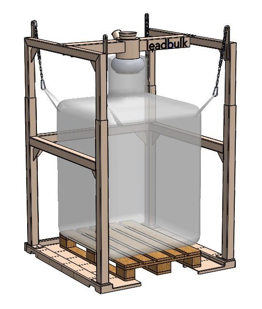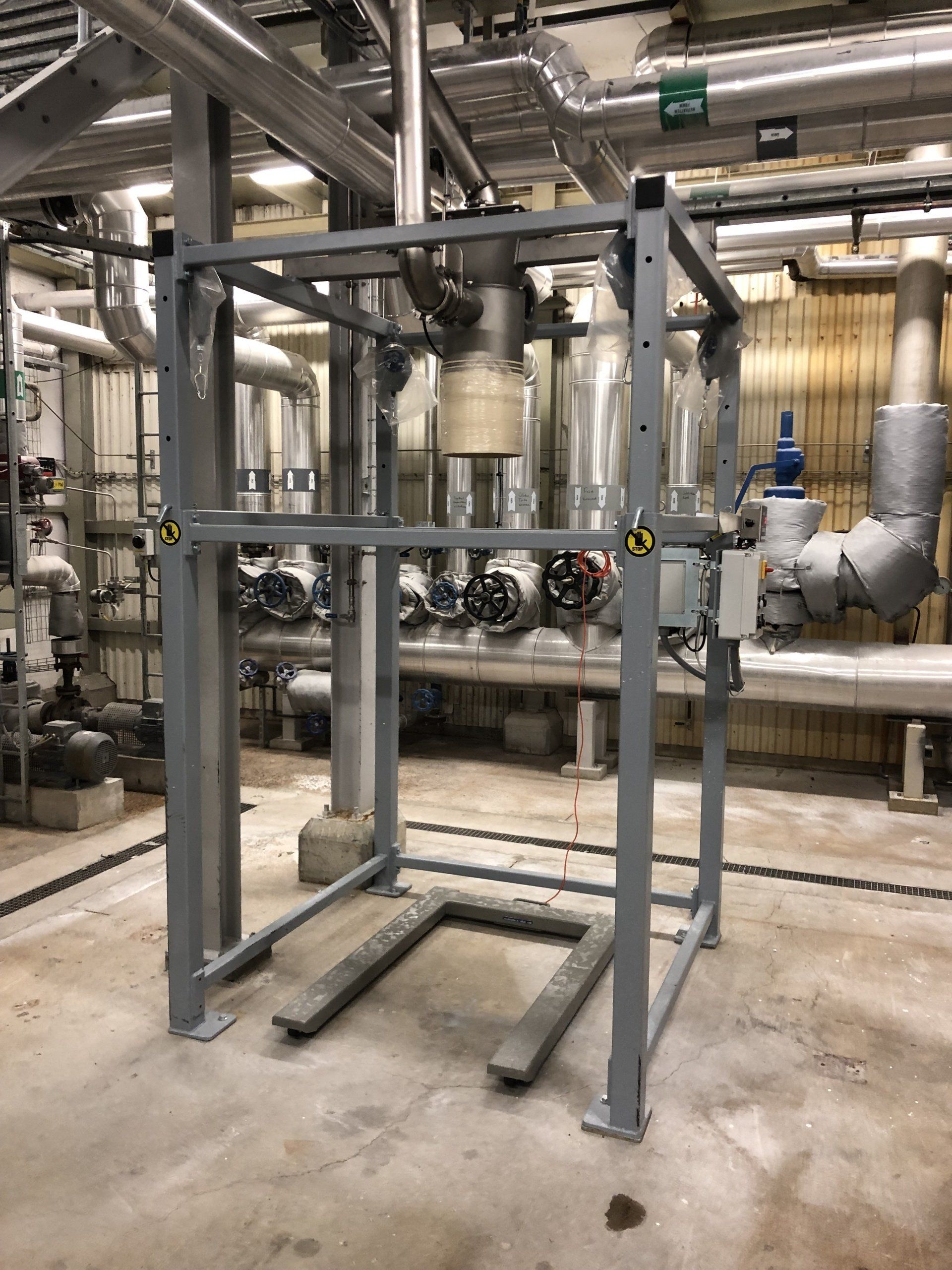 I storsäcksfyllaren placeras en euro-pall och på den placeras den tomma storsäcken. Vår storsäcksfyllare kräver inte att pallen lyfts in med motviktstruck utan fungerar lika bra med handtruck eller ledstaplare. Storsäckens lyftöglor hängs sedan upp i fjäderbelastade krokar i varje hörn. För att sedan skapa en dammtät koppling mellan storsäckens fyllningsstos och storsäcksfyllaren träs storsäckens fyllningsstos upp på det yttre röret och fixeras på plats genom att blåsa upp gummibälgen. Inuti det yttre röret på storsäcksfyllaren ligger ett fyllrör som matningsutrustningen ansluts till. Detta sticker ner i säcken och fyller säcken med material. Mellan det yttre röret och fyllröret finns en luftspalt med aspirationsstos där luften som finns i den tomma säcken evakueras till vid fyllning.