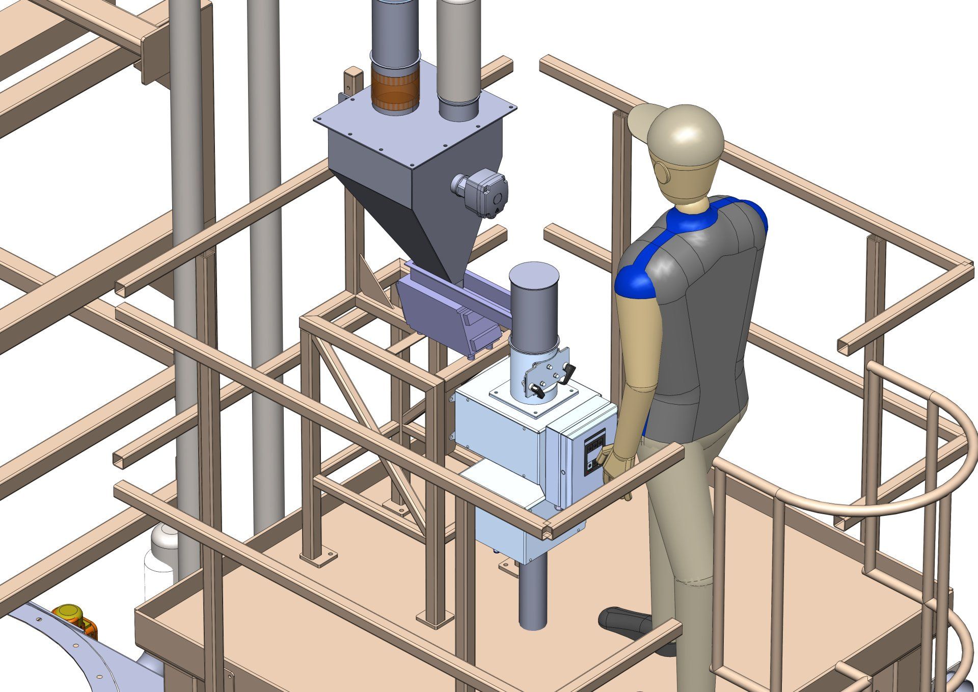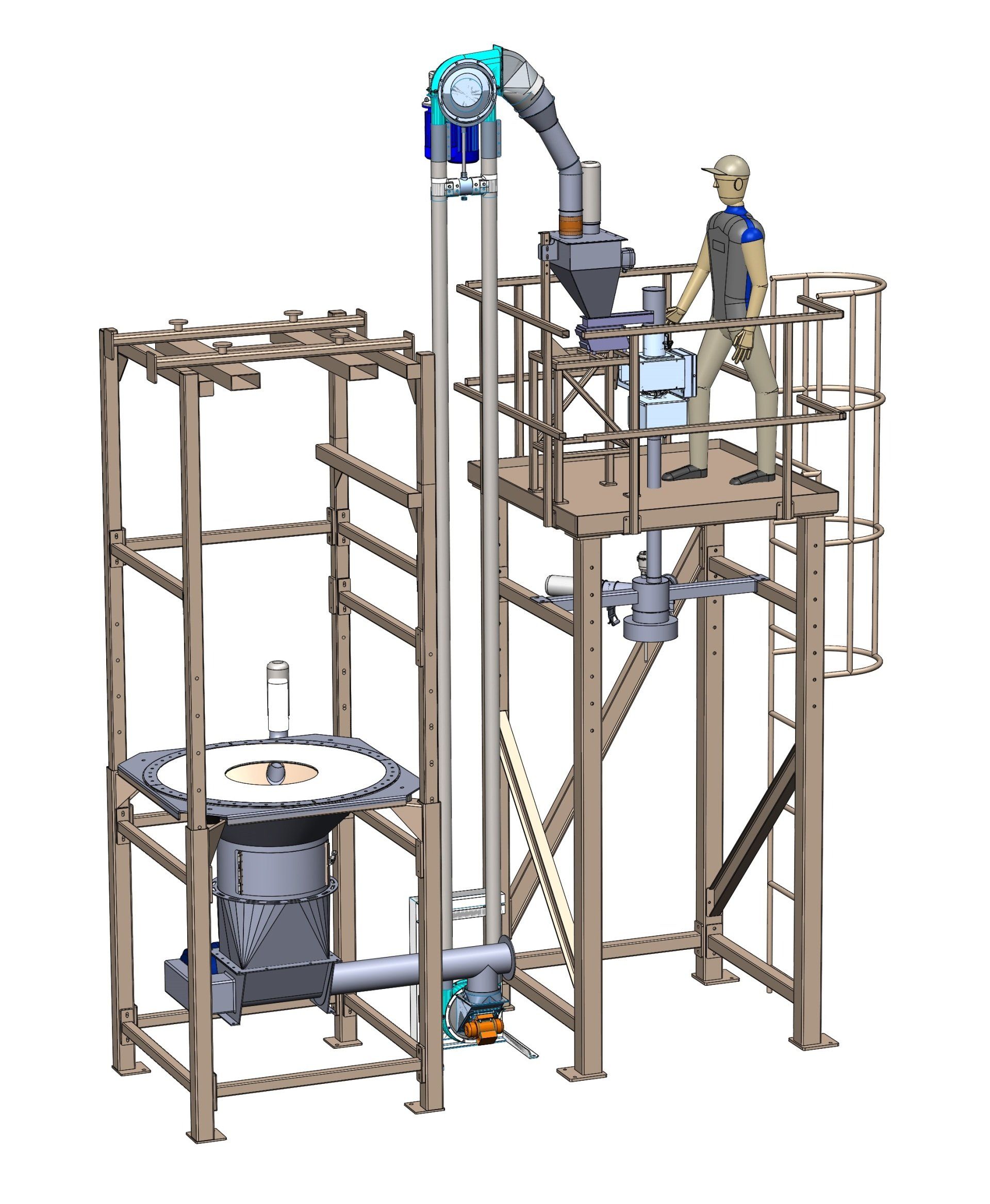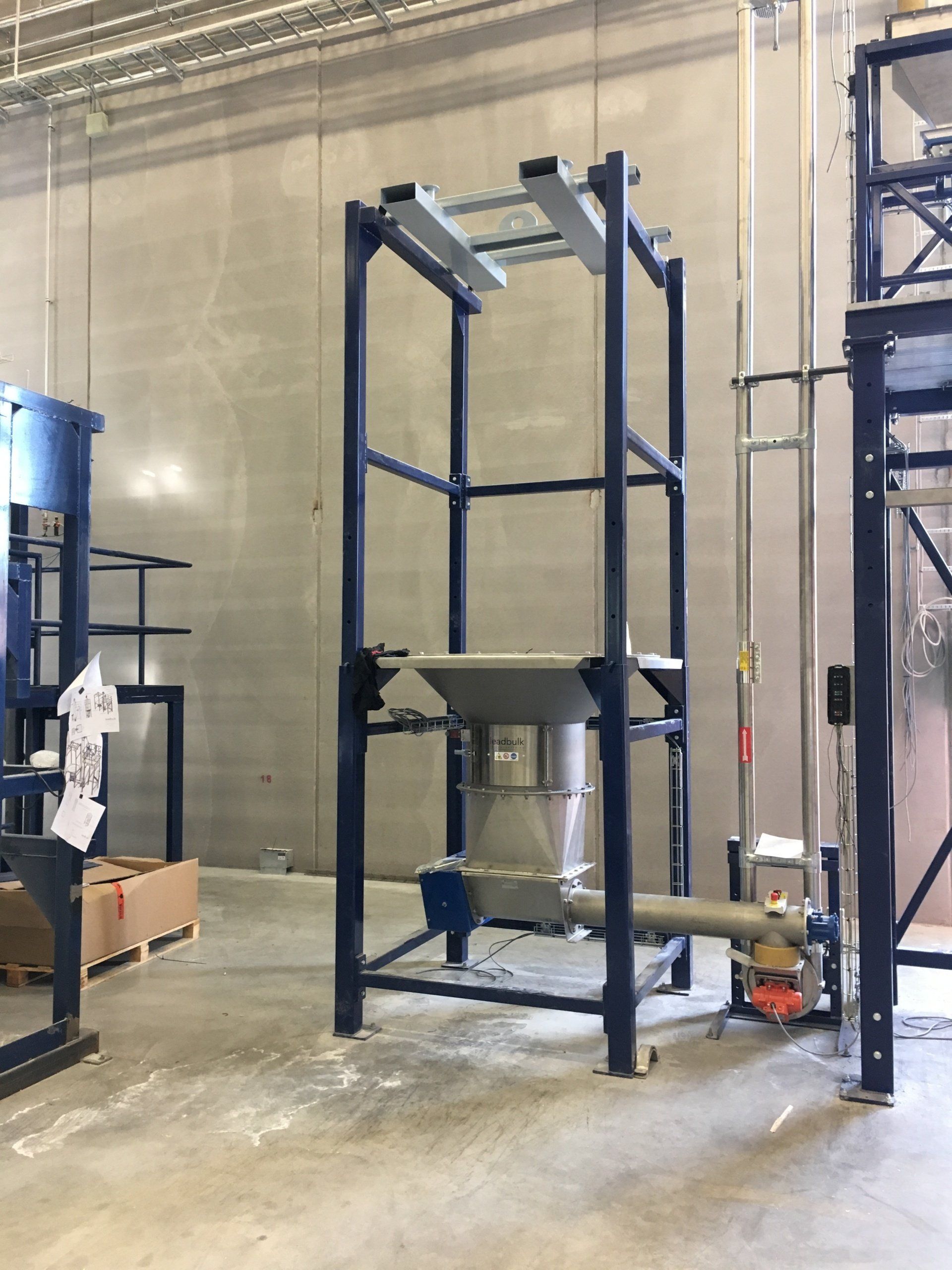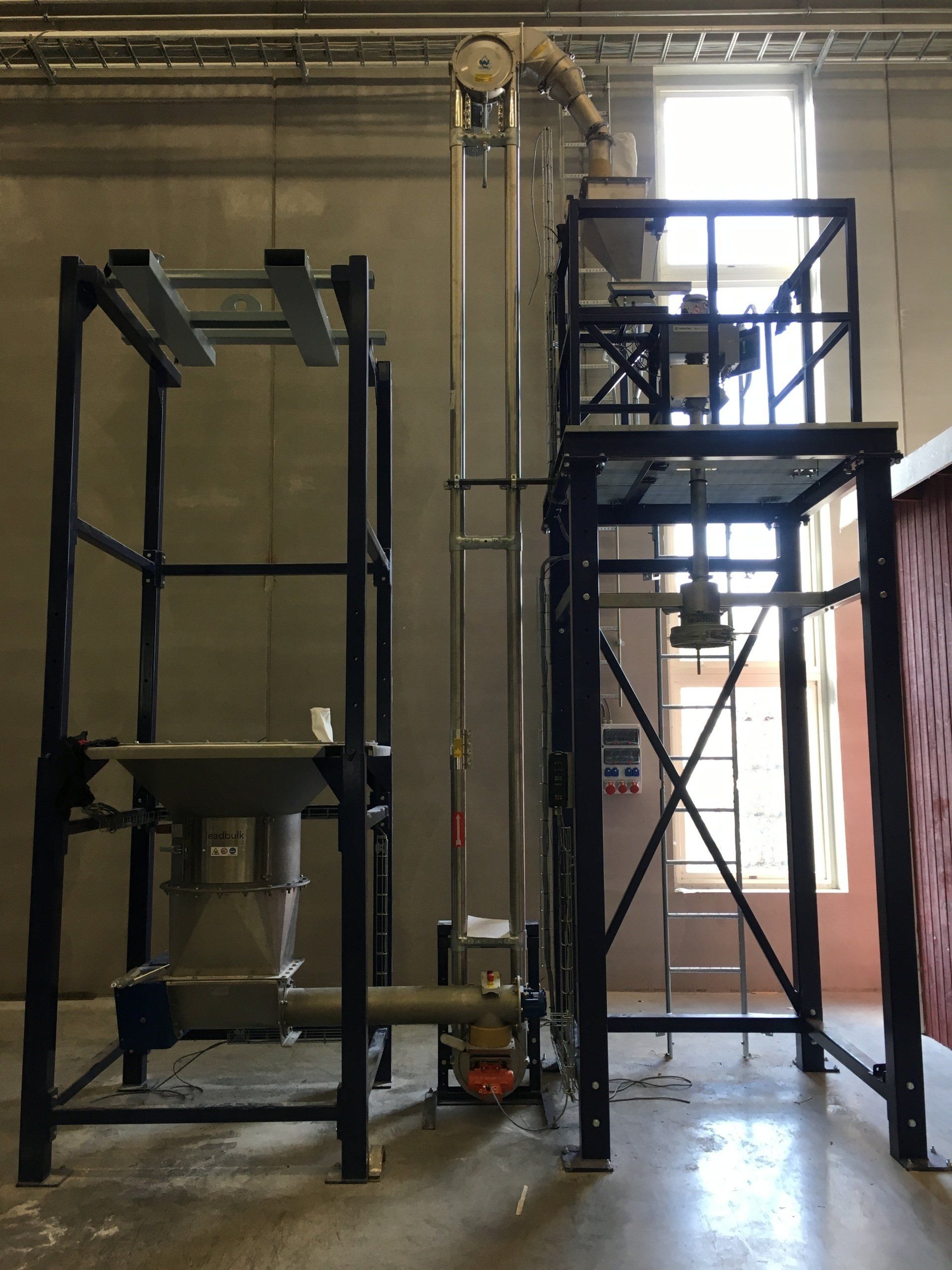 En storsäckstömmare med skruvtransportör fyller en wiretransportör för lyft av produkt till en metalldetektor. Metalldetektorn matas av en vibrodoserare. Efter metalldetektorn fylls produkten i storsäck.