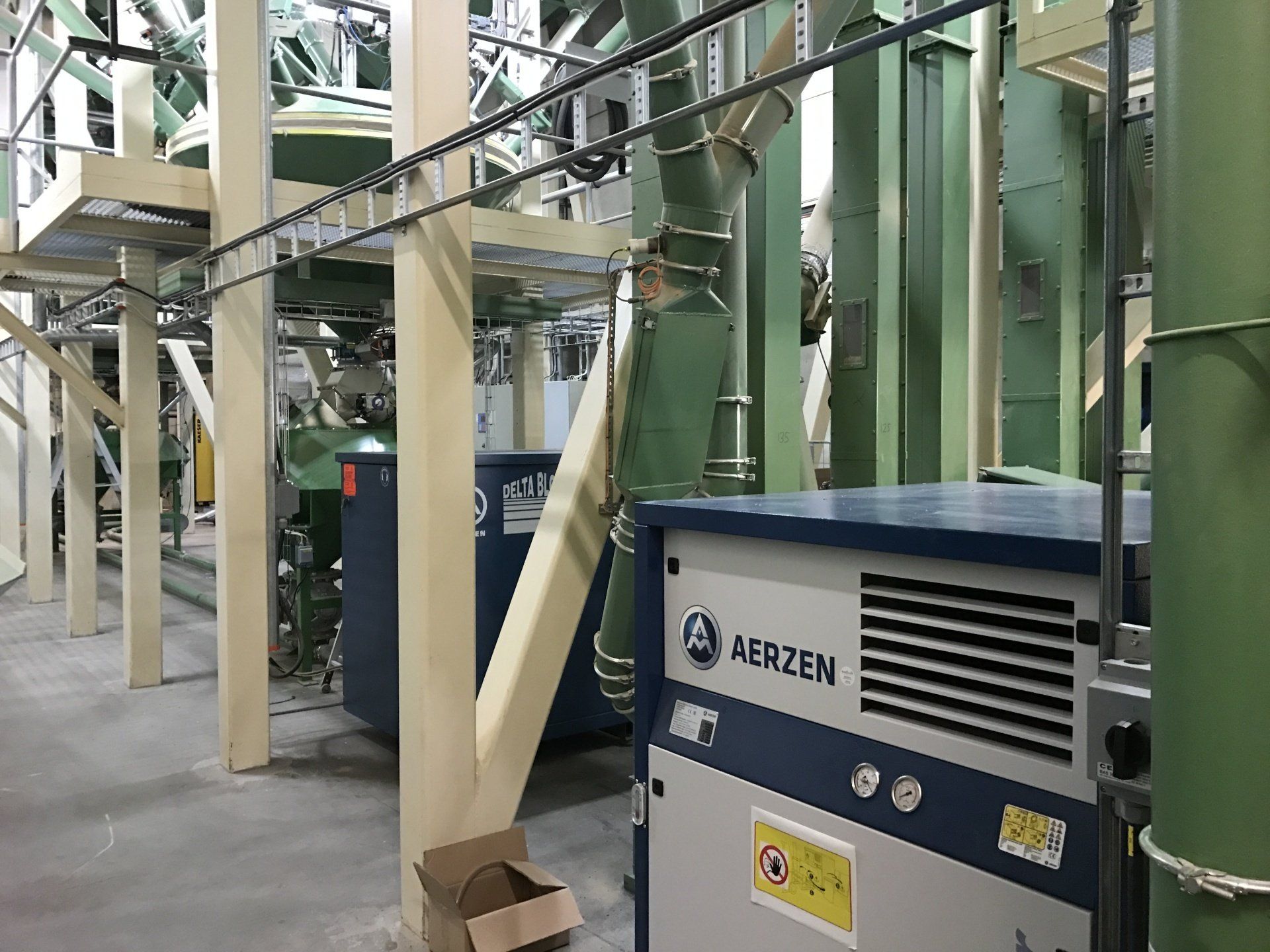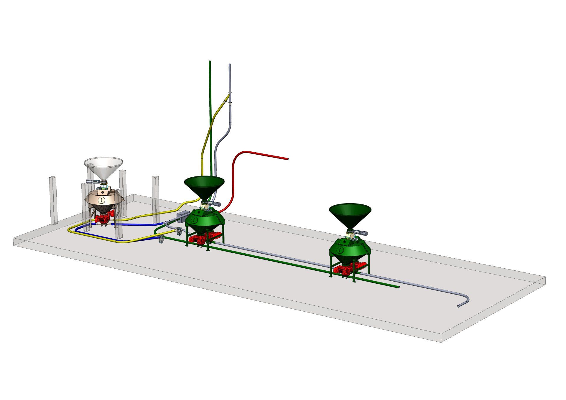 -Transportsystem med ett flertal 2-vägsfördelare och blåsmaskin till mottagningskärl.