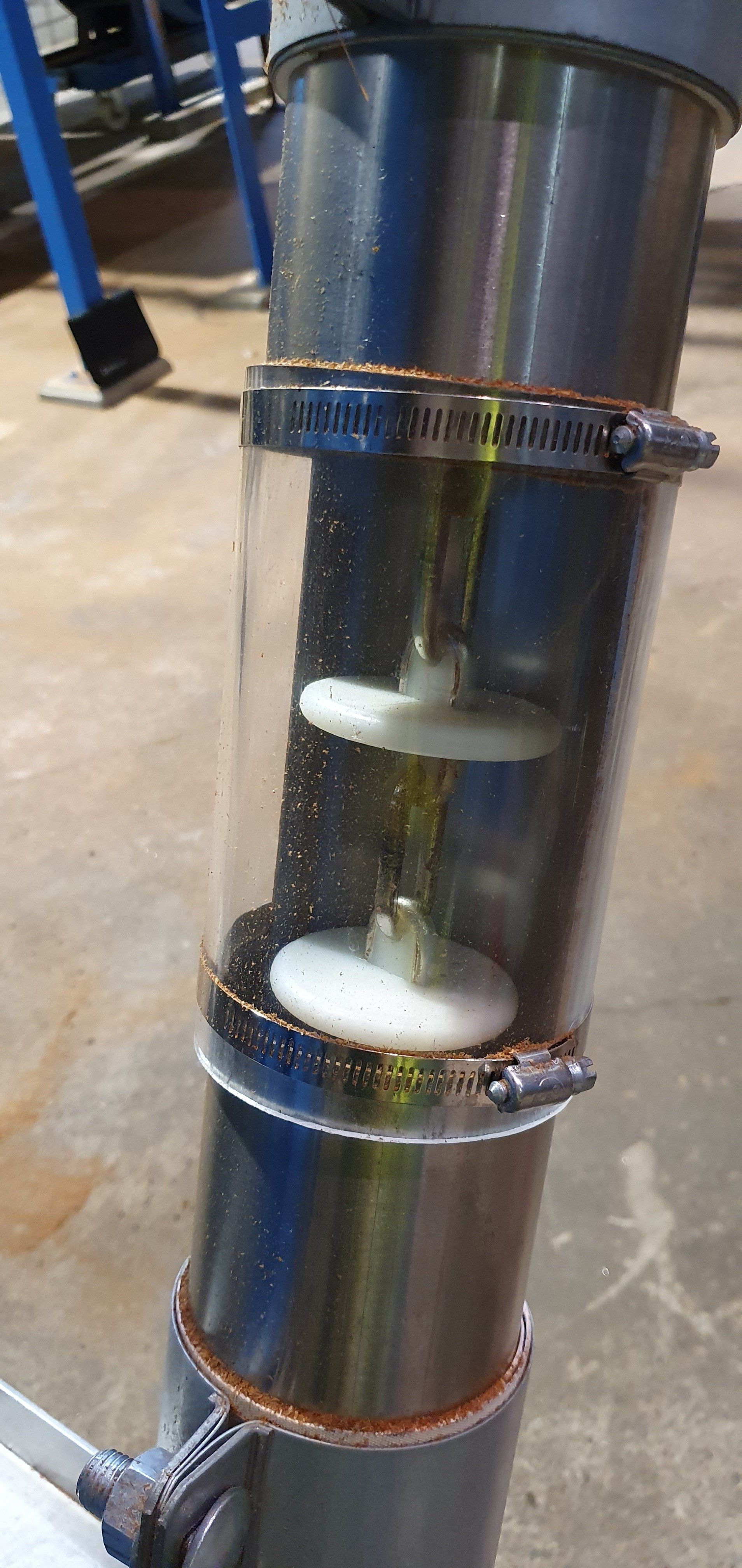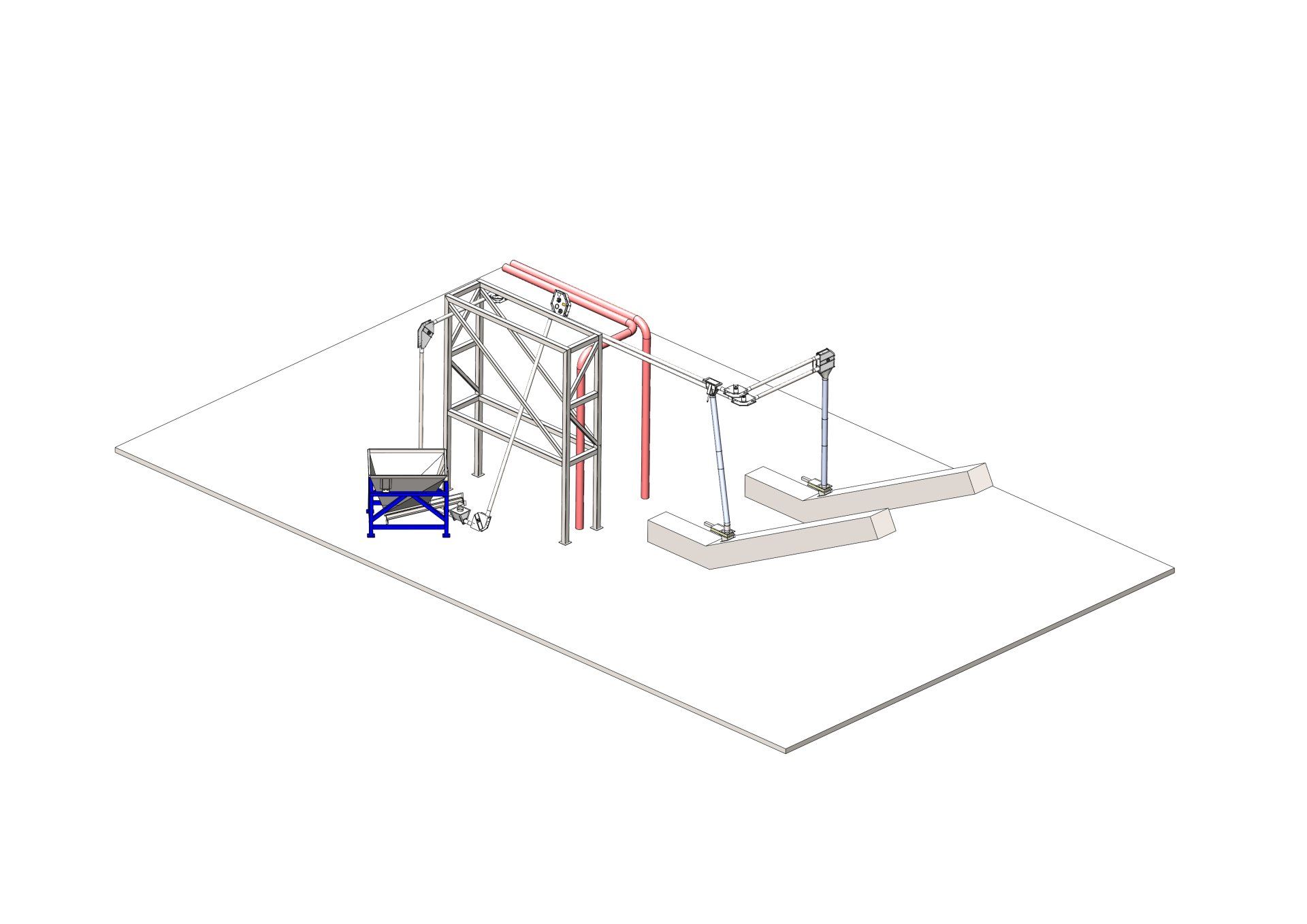 En Rostfri utmatar skruv Ø168mm med en kapacitet på 7,0m³/h matar ut materialet till en Disc-kedjetransportör som lyfter materialet ca. 5 meter vertikalt, samt förflyttar produkten 25 meter horisontellt innan den mats ut till respektive kedjetransportör.
